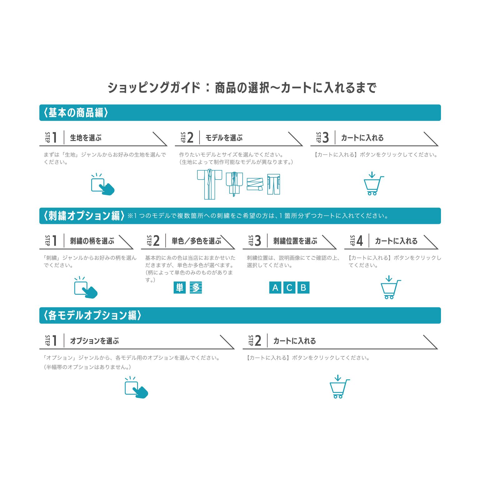 単色のみの柄です。 刺繍糸は基本的に当店におまかせとなりますが、ご希望がありましたら備考欄に入力してください。 〈刺繍位置〉 レディースゆかた:A(左胸)/B(掛衿)/C(裾) 子どもゆかた:A(左胸)/B(裾) 子どもゆかたオプション・へこ帯:A(たれ先) 半幅帯:A(たれ先)/B(胴回り) タイパンツ:A(両ポケット)/B(右ポケット)/C(左ポケット) ※ 布と一緒にカートに入れてください。 ※ 単品での販売はいたしかねます。 ---------- ●各モデルごとのオプションもご用意しています。 ≫ オプション類を見る https://shop.tobari-sewing.com/categories/4939168